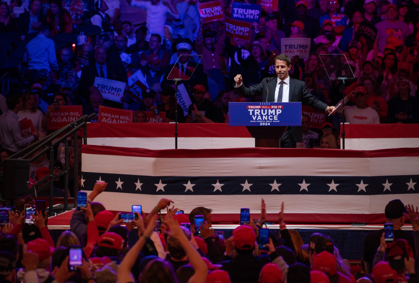 Tony Hinchcliffe at a Trump rally on Oct. 27 at Madison Square Garden in New York. (Peter W. Stevenson /The Washington Post via Getty Images)