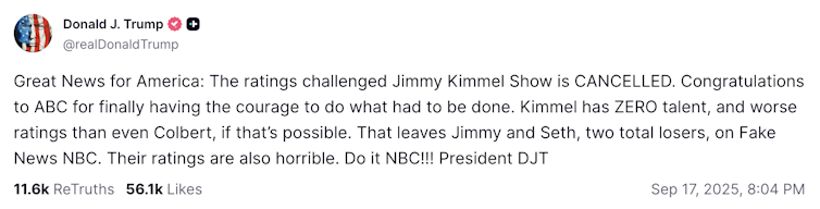 Following unprecedented threats from Federal Communications Commission Chairman Brendan Carr, major affiliate station owners Nexstar and Sinclair Broadcasting pressured Disney’s ABC to pull Jimmy Kimmel’s show off the air over his comments related to Charlie Kirk’s killing.