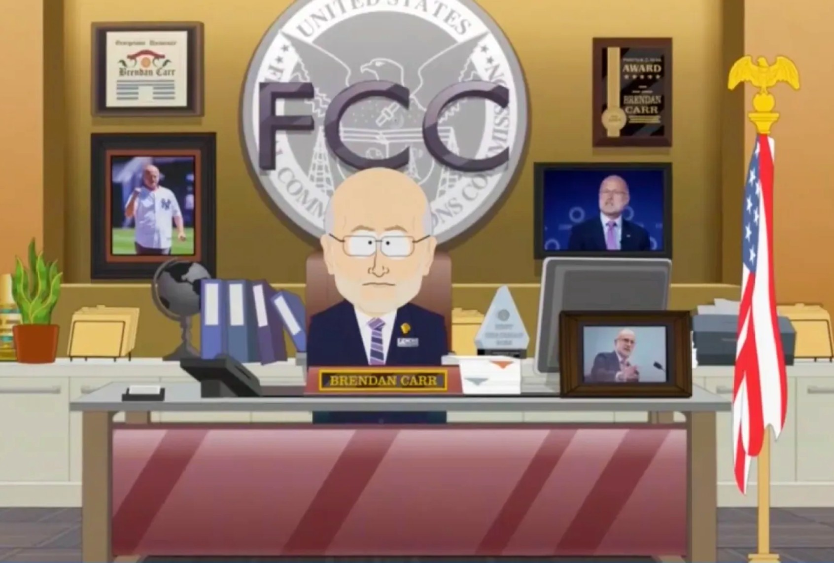 “Conflict of Interest” takes aim at FCC Chairman Brendan Carr, who recently pressured ABC to take Jimmy Kimmel Live! off the air. The episode places Carr in a string of slapstick misadventures involving President Donald Trump, who is trying to abort a child he is having with Satan. Carr falls down stairs, eats a poisoned meal and contracts toxoplasmosis, which the show jokes could threaten his “freedom of speech.” In one scene, the JD Vance character directly references Carr’s real-world warning to ABC: “We can do this the easy way, or the hard way.”