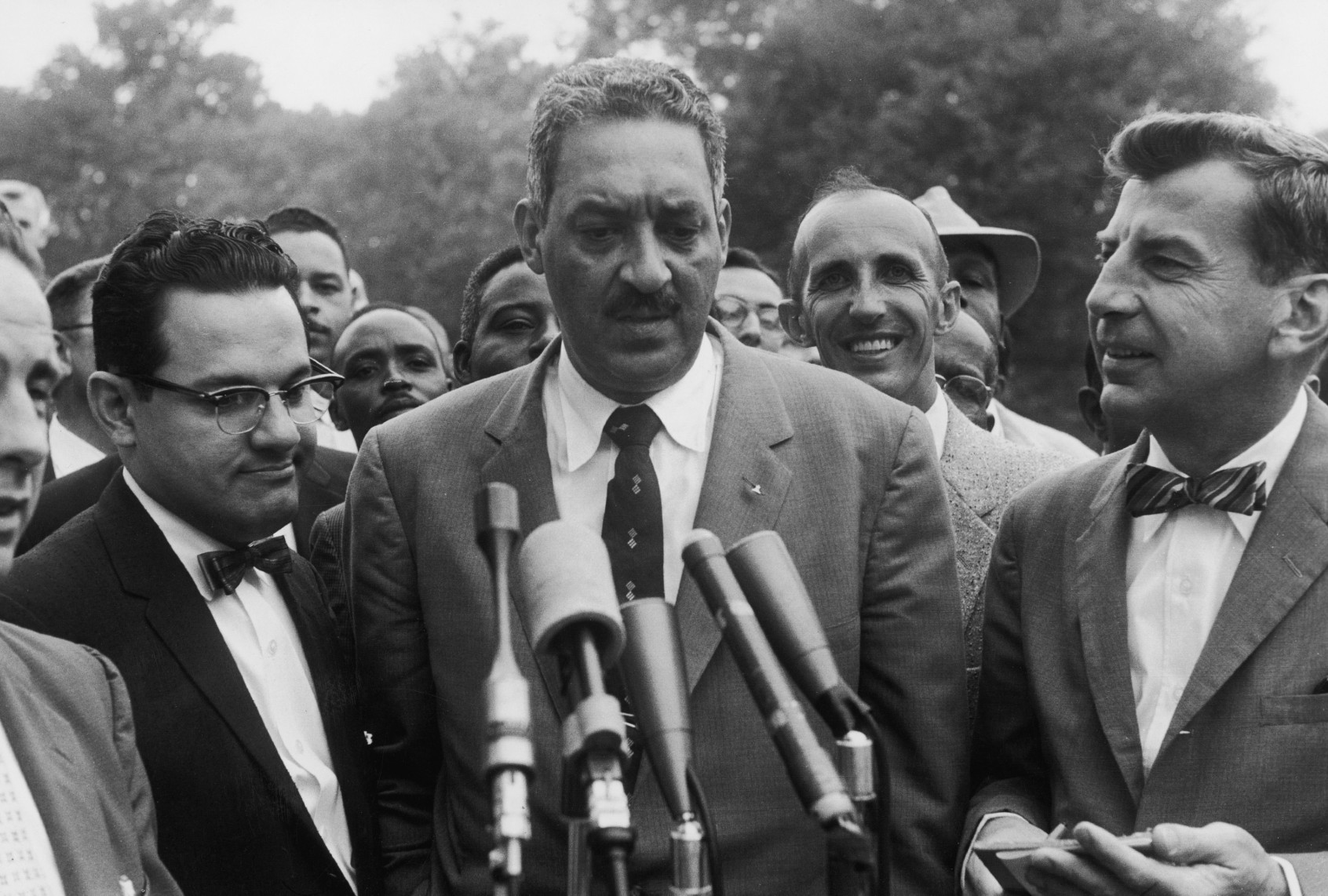 (Shutterstock/Courtesy of PBS) Thurgood Marshall speaking to the press in Washington, DC, August 1958.