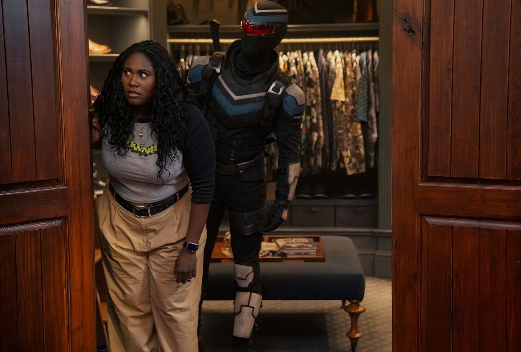 So when Adebayo and the rest of Peacemaker’s 11th Street Kids, a misfit crew that includes Emilia Harcourt (Jennifer Holland), Vigilante (Freddie Stroma) and Economos (Steve Agee), follow Chris into the dimension known as Earth X, Adebayo doesn’t suspect this place might be hazardous to her health. After all, the entry point to this parallel universe is a tony study inside a well-appointed McMansion. A window provides a view of a tree-lined street. It’s nothing like Chris’ shabby rambler in Earth Prime.